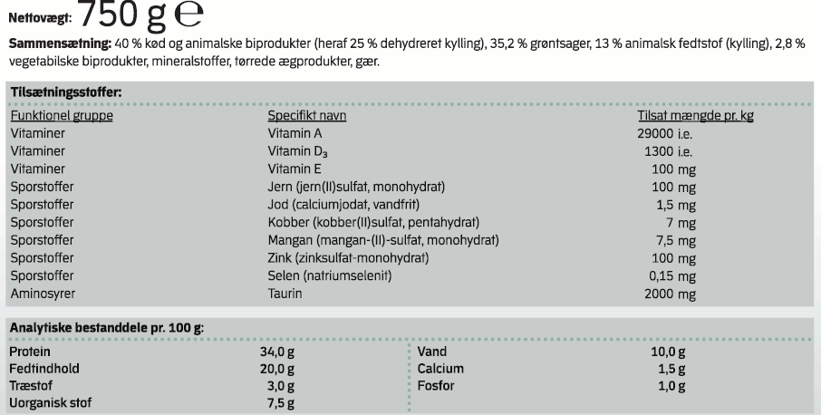 Taurin forekommer naturligt i kød, men i varierende mængder. Derfor har Excellentpet valgt at tilsætte 2000 mg. taurin pr. kg tørfoder. Du er således sikker på altid at kunne opfylde kattenes behov for det livsvigtige stof, når du fodrer med Excellent Pet. Mangel på Taurin, over en længere periode, kan bl.a. give synsproblemer og dårligt hjerte.