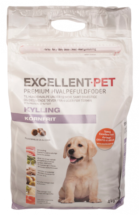 4 kg Excellentpet kornfrit hvalpefoder med 22% Kylling er specielt udviklet til hundehvalpe i alderen 6 uger til 12 måneder, samt til drægtige tæver fra 4 uger før de nedkommer og frem til, at hvalpene stopper med at die. Foderet er universalt og kan bruges til alle hunderacer, der er sunde og raske. Foderpillerne er i mellemstørrelse for at sikre, at hvalpene får brugt deres tænder når de spiser foderet.